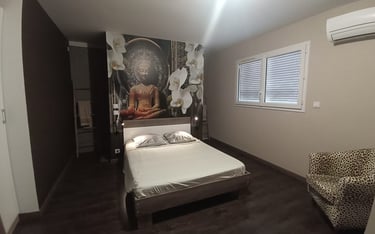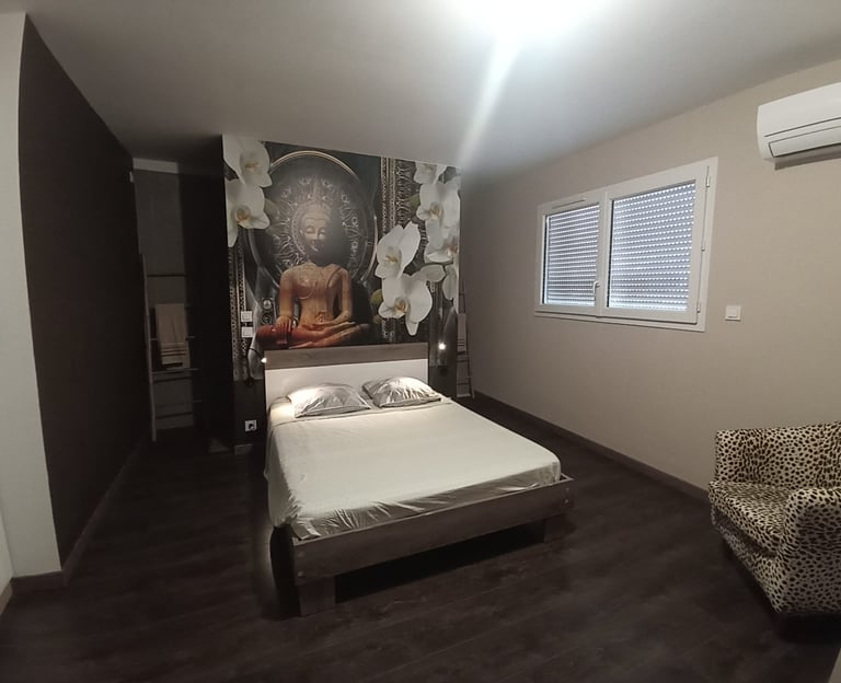 Une chambre zen à l’ambiance Bouddha, parfaite pour un séjour apaisant, avec salle de bain privée.